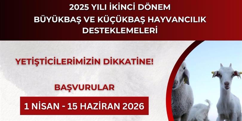 28.07.2024 tarihli ve 32613 sayılı Resmi Gazete'de yayımlanan ''2024-2026 Yıllarında Yapılacak Hayvancılık Desteklemelerine İlişkin 8760 Sayılı Cumhurbaşkanlığı Kararı'' kapsamında; birinci dönemde başvuru yapmayan yetiştiricilerimizin 2025 yılında doğan buzağı, oğlak ve kuzuları için ikinci dönem destekleme başvurularını 01.04.2026-15.06.2026 tarihlerinde bağlı bulundukları İl- İlçe Müdürlüklerimize yapması gerekmektedir.